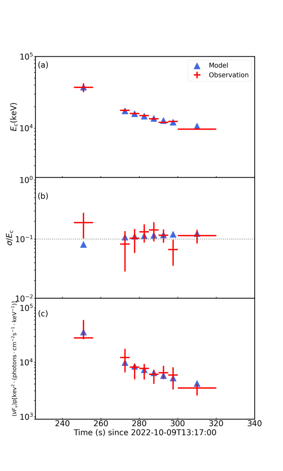 为了解释发射线的时间演化,中国科学院云南天文台刘杰英博士和毛基荣研究员、中国科学院高能物理研究所熊少林研究员和张艳秋博士组成的合作团队提出,在该伽玛射线暴的亚光球层区域,正负电子对湮灭产生原始的发射线,这些原始发射线光子经过周围高温和高密度介质时,与介质中的电子散射,发射线光子损失能量,从而发射线线心的能量和总辐射强度减弱。这一过程被称为康普顿软化(见图1)。结合伽玛射线暴喷流动力学过程,康普顿软化理论模型可以系统地解释伽玛射线暴高能发射线的时间演化特性(见图2),并同时对喷流内部介质的物理性质(温度和密度)进行了测量。