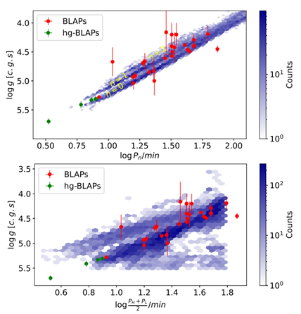 研究发现,金属丰度是决定脉动能否被激发的主要因素,而包层厚度和氦氢比影响较小。值得注意的是,若BLAPs的脉动为基频径向模式,则其观测到的脉动周期、周期变化率以及在赫罗图中的位置均可得到合理解释;理论预测的周期(P)-表面重力加速度(log g)关系分布较窄,但实际观测表现出较大的弥散度,提示可能存在尚未完全理解的动力学或化学演化过程,也可能受模式证认的影响。总体来说,所有的主要观测特征——如可激发模型在赫罗图上的分布(见图一)、周期变化率(见图二)、周期-重力加速度关系(见图三)、恒星表面氢氦比等——均被理论模型成功再现(空间动力学特征除外,本研究不涉及)。