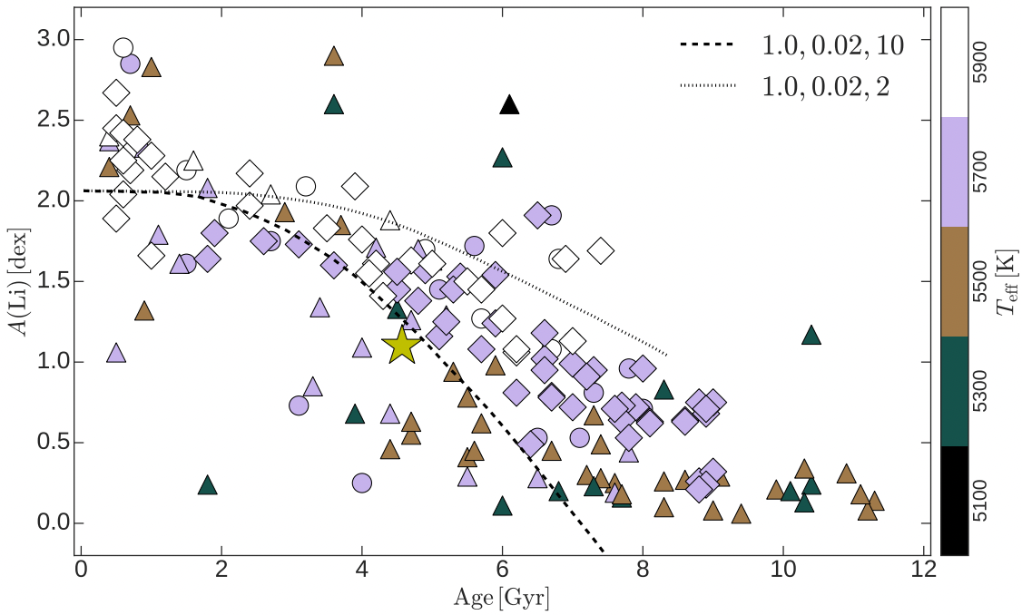 图1: 太阳类似物锂丰度随主序年龄的演化。散点是观测样本,线条是模型的演化轨迹,输入速度分别是10和2公里每秒。