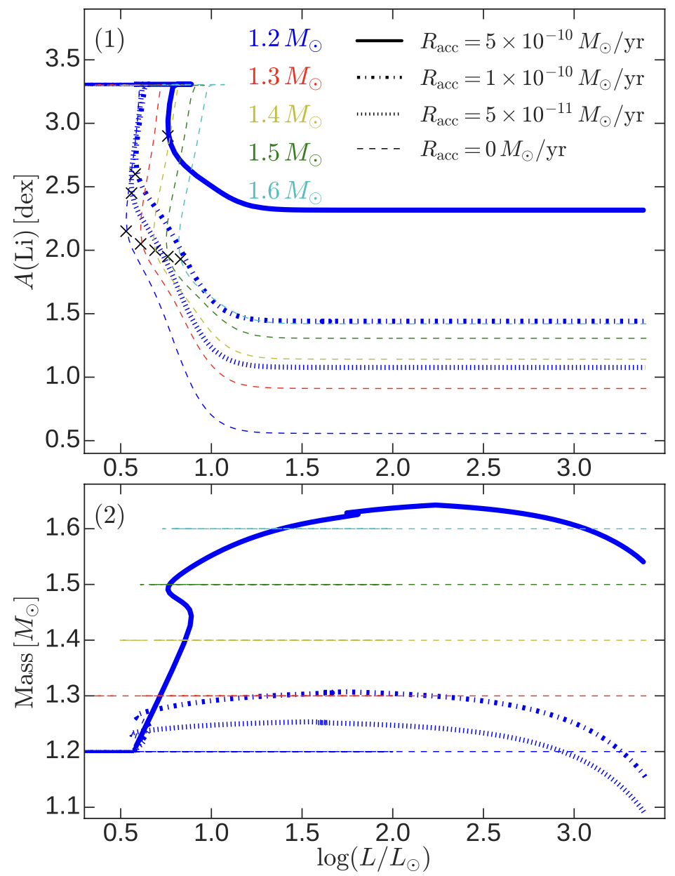 图3: (1) 不同模型的锂丰度随光度的演化。(2) 对应于图(1)的模型质量随光度的演化。