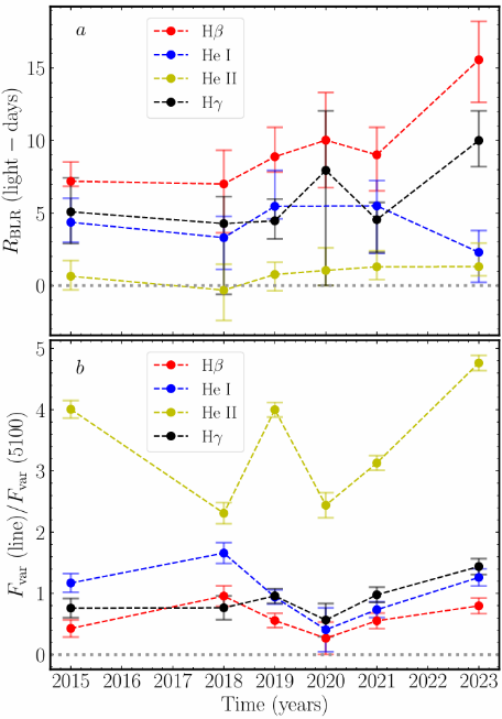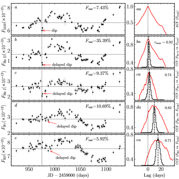 本工作依托云南天文台2.4米望远镜, 对NGC 5548在2023观测季进行了74次光谱监测,利用反响映射方法的进行了处理,分别得到了四条发射线非常明显的时间延迟效应。研究发现各条发射线发射区的径向分层结构显著并且稳定,但各发射区的动力学性质随以年为单位的观测季发生了显著演化。这激励研究团队结合观测数据对宽线区进行进一步的动力学建模研究。