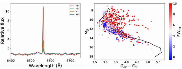 图1. 左:不同光谱型UCDs的Hα发射谱线;右:Hα谱线发射量随UCDs演化轨迹(黑色线)的分布,年轻的UCDs更为活跃。