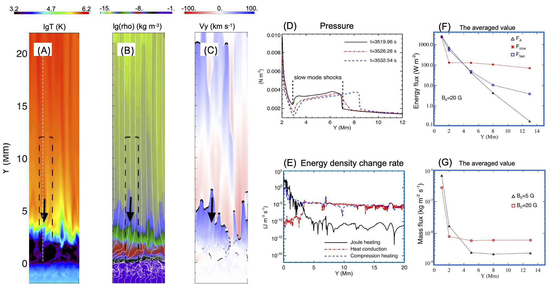 1:针状体数值模拟结果。(A-C)分别为一批针状体在上升阶段时的温度对数、密度对数和垂直太阳表面方向的速度分布,黑色箭头指向了其中一个针状体的顶部;(D)展示了沿着图(A)中白色虚线在三个不同时刻的压强分布;(E)为沿着图(A)白色虚线不同物理项导致的能量密度变化率的绝对值;(F-G)分别为磁流体力学波携带的平均能流和平均质量流随高度变化。