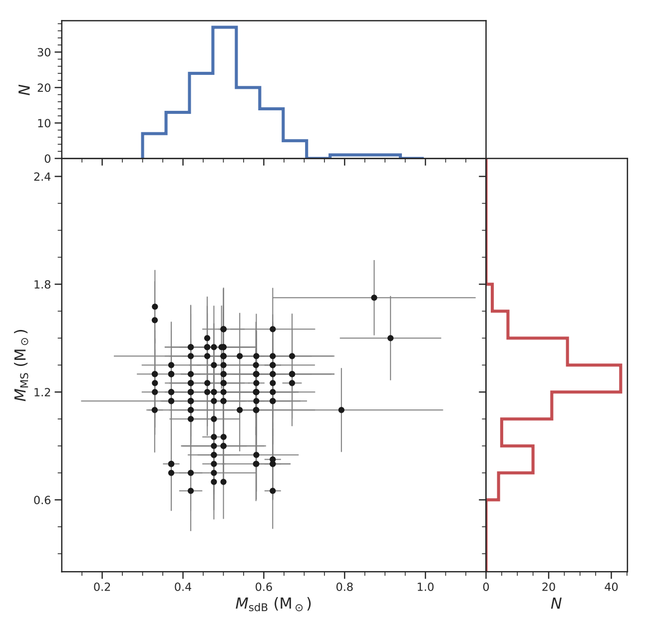 图1:双星系统中热亚矮星与主序伴星的质量分布,热亚矮星质量集中于0.5 M⊙附近,而主序伴星质量范围较宽。