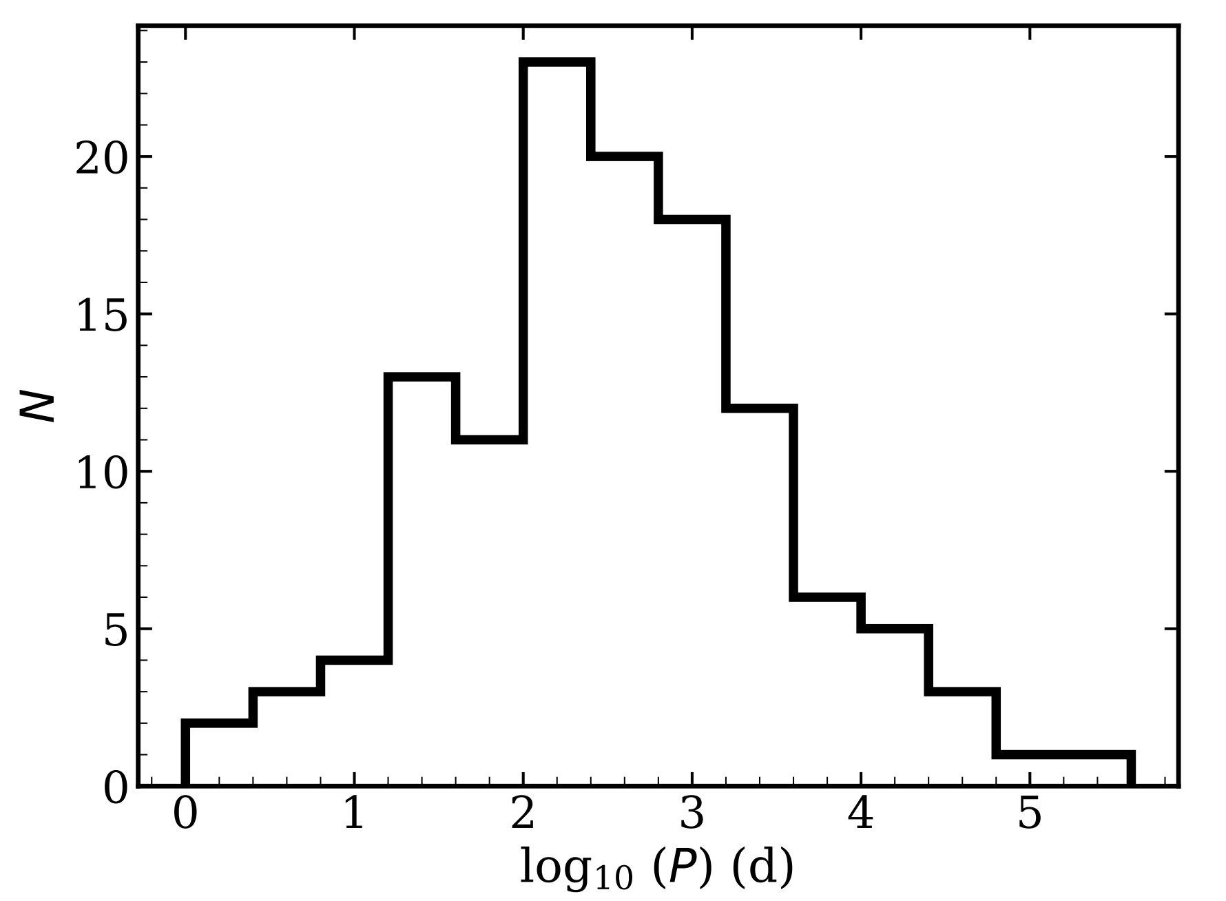 图2:通过蒙特卡洛方法统计推断的轨道周期分布,系统周期主要集中在数十天至数千天的长周期区间。