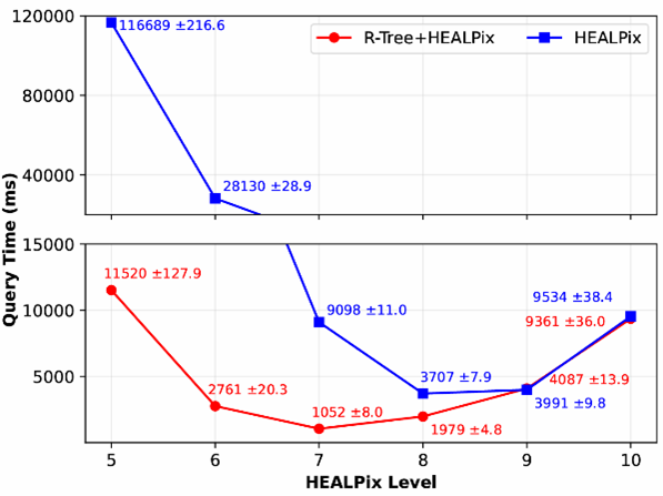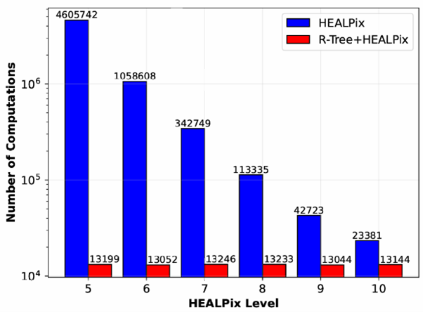 实验结果表明,该HEALPix–R-Tree混合索引方法在锥形检索等典型空间查询任务中,相较于传统单级索引方法具有更高的查询效率和更好的可扩展性。尤其是在大规模数据条件下,该方法能够显著减少数据访问量和查询时间,同时避免了传统数据库系统在部署与维护方面的复杂性。