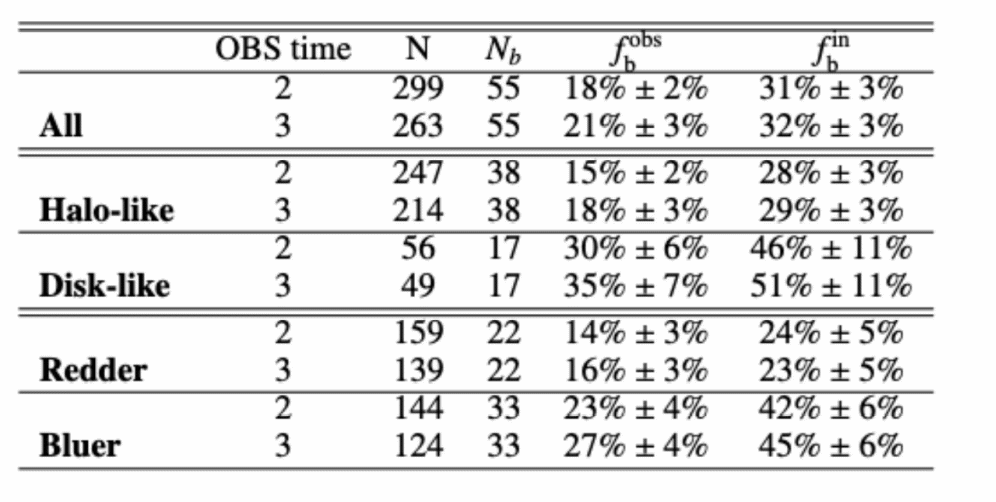 该研究基于LAMOST数据,找到299颗具有多次一致性视向速度测量值和可靠大气参数的蓝水平分支星样本,利用蒙特卡洛模拟的方法对样本的双星比例进行研究和校正。研究结果显示(表一):BHB内禀双星比例约32%,其中类盘BHB星(高金属丰度、高自转速度)的内禀双星比例高达51%,类晕BHB星(低金属丰度、低自转速度)仅为29%。这说明类盘BHB可能主要通过双星相互作用形成,而类晕BHB更多来自单星演化。此外,高温BHB星的双星比例(45%)近乎低温BHB 样本(23%)的两倍。这一结果表明双星相互作用与有效温度之间可能存在联系。该成果为揭示BHB双星比例的环境依赖性提供了数据支撑,也为理解蓝水平分支星的形成及演化提供了新的观测证据。