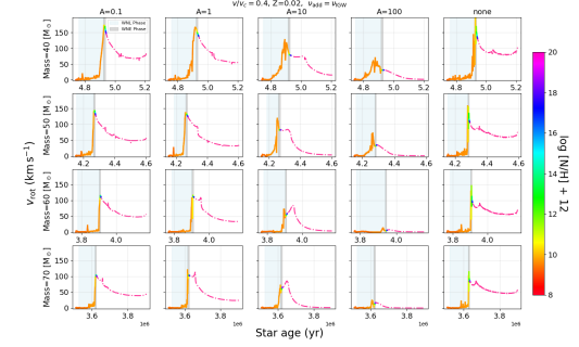 图1 :大质量恒星模型在核心氦燃烧阶段表面速度的演化。不同曲线表示在对流包层底部激发的重力内波强度的差异,由参数A控制。颜色代表表面氮丰度;蓝色与灰色阴影区域分别对应WNL 和 WNE 阶段。氢完全剥离后的演化轨迹以粉色点划线显示。
