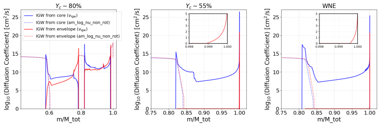图2 :60M⊙ 模型(A = 10)在中心氦燃烧阶段不同时刻由重力内波引起的粘度扩散系数分布。蓝色与红色曲线分别表示在对流核边界激发的重力内波与在对流包层底部激发的重力内波所贡献的扩散系数。虚线表示来自其他过程(主要以对流为主)的背景扩散,作为对流边界处的参考基线。中间与右图对应的时刻,由于对流包层已减弱或消失,重力内波强度已经极弱。