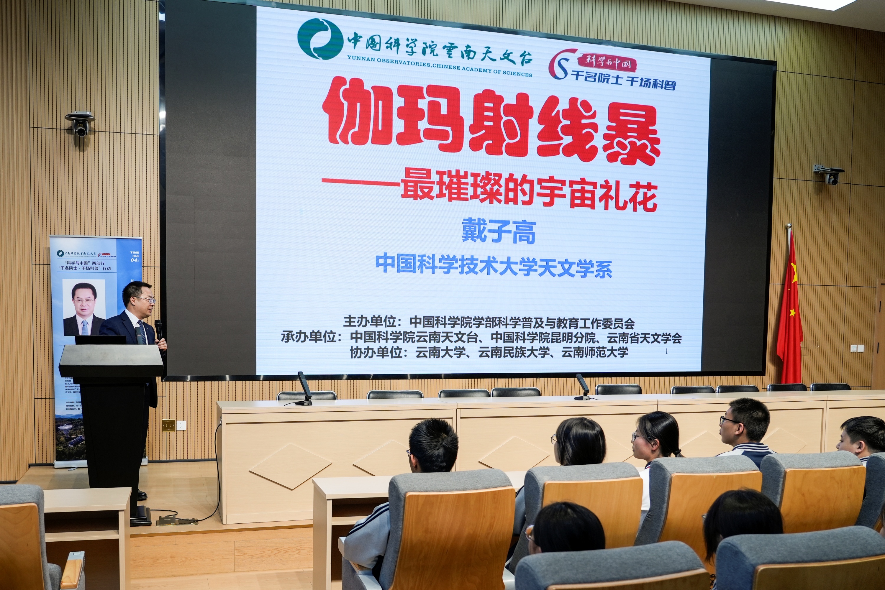 2026年4月9日,“科学与中国——千名院士·千场科普”行动之天文学前沿讲座走进云南。本次活动由中国科学院学部科学普及与教育工作委员会主办,中国科学院云南天文台、云南省天文学会承办,并得到了云南民族大学、云南民族大学附属中学教育集团、云南师范大学、云南师大附中、以及中国科学技术大学的大力支持与协办。活动特邀中国科学院院士、中国科学技术大学“王绶琯讲席”教授戴子高担任主讲嘉宾,先后在云南民族大学附属中学和云南师范大学附属中学举办了两场题为《伽玛射线暴——最璀璨的宇宙礼花》的科普报告,两校合计约900余名中学生现场聆听了这场来自宇宙深处的科学盛宴。
