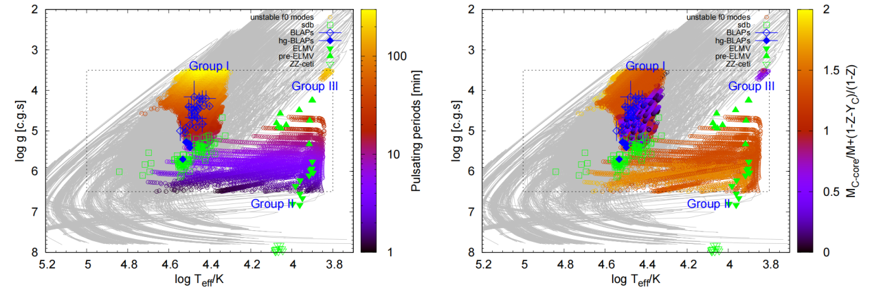 图一、可激发径向基频脉动的理论模型在赫罗图上的分布。左图以色标表示脉动周期、右图以演化状态参量着色(0~1:中心氦燃烧; 1~2:氦壳层燃烧)。