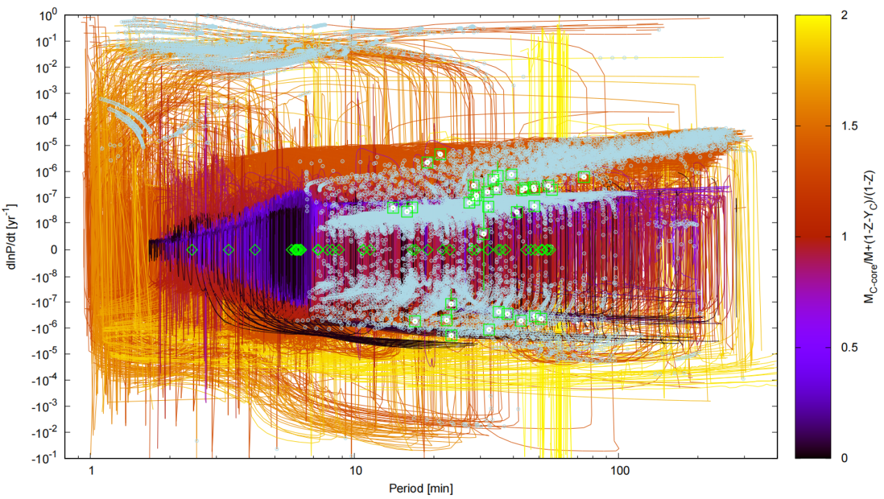 图二、脉动周期与周期变化率图。绿色方块和菱形表示观测数据(带误差棒者为实测周期变化率),淡蓝色圆点为可激发理论模型。曲线按演化状态参量着色。