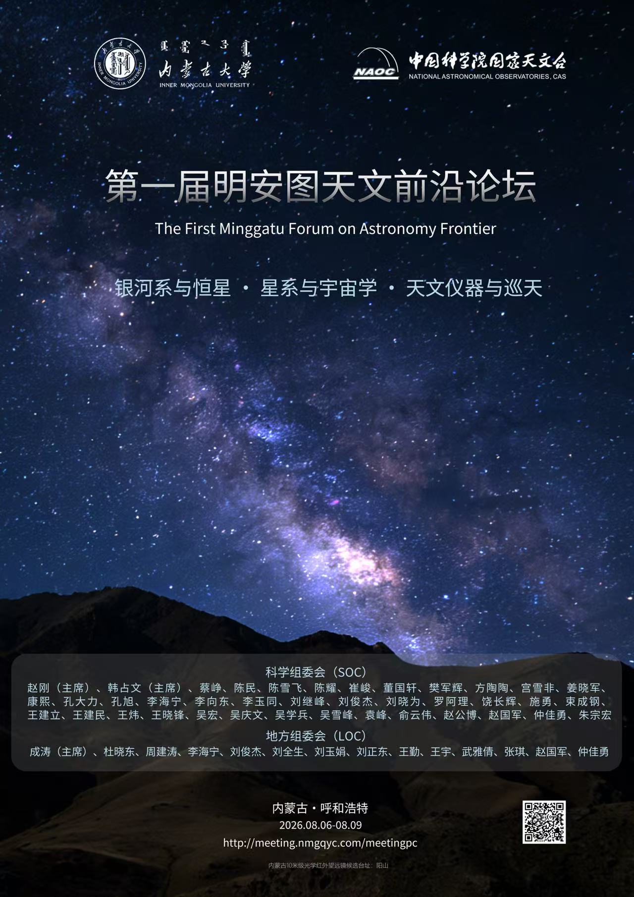 随着国内外一系列重大天文设施的建成使用和突破性成果的持续产出,天文学研究正步入前所未有的黄金发展时期。天文学与物理学等学科的交叉融合不断深化,为探索宇宙奥秘、揭示物理规律提供了强大支撑。为进一步促进学术交流、凝聚科研合力,推动内蒙古地区天文与物理学科的快速发展,提升区域在国内外天文研究中的影响力与参与度,定于2026年8月6日- 8月9日在内蒙古呼和浩特举行第一届明安图天文前沿论坛。 本次论坛将围绕天体物理及国家大科学装置相关研究进展,促进实测天体物理、实验室天体物理与核天体物理等领域的深入交流,推动我国天文及相关交叉学科的进一步发展。我们将邀请国内外顶尖科学家做大会报告,同时欢迎广大科研人员积极参与学术交流,分享最新成果与研究构想。期待通过搭建高水平的学术交流平台,吸引更多优秀学者关注和支持内蒙古天文事业,共同助力地方科研能力提升、人才培养与学科建设,为我国天文事业的进步贡献力量。